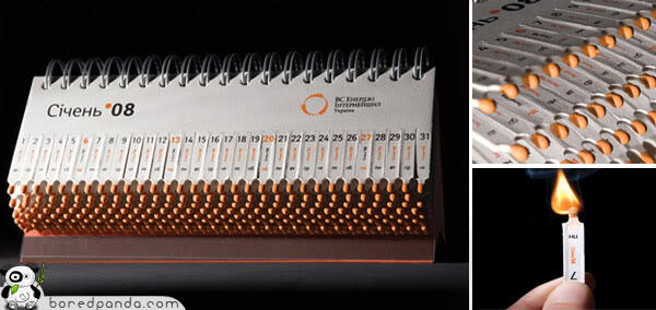 Dirancang oleh Yurko Gutsulyak, ide itu untuk membuat sebagai unik kalender sehingga proses penyajian yang akan menjadi acara yang luar biasa. Setiap halaman adalah bulan dan itu terlihat seperti sisir yang terbuat dari korek api yang sesuai setiap harinya. korek api ini adalah nyata dan dipastikan kalender benar-benar aman.